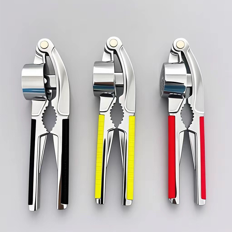 A stainless steel garlic press provides efficient and effortless garlic crushing, saving time and effort in food preparation.